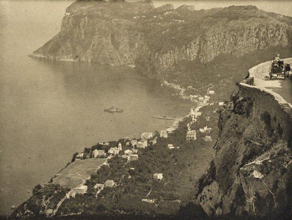 Curator: Here we have a photograph from 1896 by Henry Pauw van Wieldrecht. It’s titled "Klif uitlopend in zee (fjord in Noorwegen?)" which translates to "Cliff extending into the sea (fjord in Norway?)". Editor: A striking first impression. It is predominantly monochrome with these large, looming cliff edges contrasted against the open water; rather imposing, isn't it? Curator: Indeed. Van Wieldrecht was part of a Dutch artistic photography movement called pictorialism, and this piece is a testament to its values. It presents photography as a handcraft, an artistic endeavor beyond mere representation, as it emulates painting techniques and principles, blurring photography into fine art. Editor: Yes, there is a painterly quality to it. I notice how the light interacts with the rugged texture of the cliff face. Notice too, how he manipulates tonal range in the image—almost like using a charcoal. And what's that strange rock column standing out at the fjord’s furthermost point? Curator: I read that artists deploying the pictorialist style aimed to convey emotion through soft focus and manipulation of the photographic print; think soft focus filters, printing on textured paper, and hand-applied chemical treatments to add texture and modify contrast, pushing back against mechanical production by engaging in hand processes, like etching or gum printing to change their imagery to emulate the look of impressionist painting. Editor: Which moves us from a study of nature to an artful mediation. And considering it, there’s something subtly dramatic in its formal elements; the somber colors, the balance between the mass of the land and the emptiness of the sea...a stark reminder of humanity’s relationship with the natural world. I'm curious though as to why this artwork appears to lack details, and in parts, appears blurred. Curator: This very quality, the use of soft focus, gives his photo a timeless or romantic atmosphere. What appears now as blurring to our eye was in his time intended to set up this artwork’s quality, meaning that such "flaws" are what gave photos this pictorialist allure. Editor: That definitely encourages a second look, an understanding that photography isn't always about pure clarity, but sometimes atmosphere, form, and that emotional resonance it was made to create. Curator: Precisely, which highlights the historical conditions for understanding what it is that we're seeing when faced with this photography; that, although understated, has much to reveal about what its cultural work has done. Editor: I will surely consider this during the next landscape picture I see.