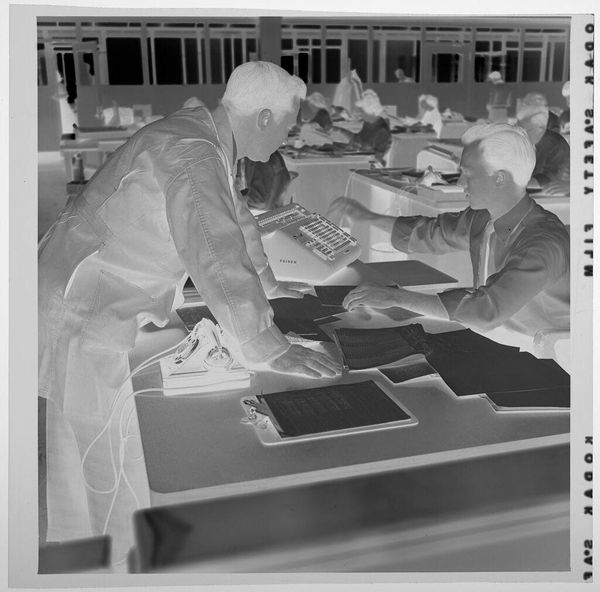 Editor: This is an untitled photograph by Jack Gould, showing a group of men looking at a blueprint. The image feels very formal and serious. What do you see in this piece? Curator: I see a concentrated depiction of power and privilege. The setting, likely a boardroom, and the blueprint suggest decision-making that impacts a wider community. Who is missing from this table, and whose voices are not heard? Editor: That's an interesting point. It does seem very exclusive. How does this relate to contemporary discussions about representation? Curator: This image becomes a lens through which we examine the historical exclusion of marginalized groups from positions of authority, prompting critical reflections on the ongoing struggle for equity and inclusion in our society. Editor: I never thought of it that way, but it makes perfect sense! Curator: Thinking about art in terms of whose voices are present, and whose are absent, can offer new insights.