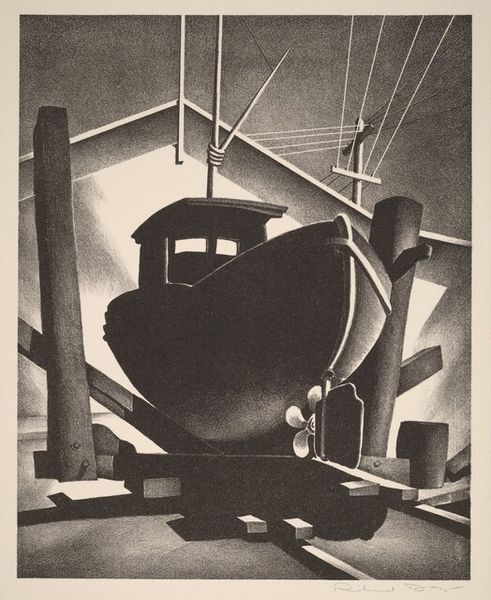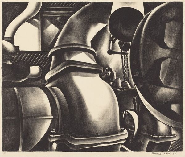 Theo Ballou White's "Machine No. 2 Boulder Dam" presents a stark vision of modern industry. The imposing machine, with its cylindrical forms and rigid geometry, dwarfs the lone worker, setting the tone for a reflection on man's relationship with the industrial age. The worker's form brings to mind the classical ideal of the heroic male nude, yet it is juxtaposed with the cold, impersonal machinery. This contrast echoes in ancient myths, where gods were challenged by the creations of mortals, and a potent reminder of the eternal tension between human ingenuity and its consequences. The horizontal lines, repeated in the worker's bench and the dam's structure, create a sense of order, yet the diagonal lines in the upper left add an element of dynamism, suggesting the latent power contained within this industrial landscape. It's a stark reminder that while humanity strives to bring order into nature, a deeper, more primal chaos always lurks beneath the surface. This cyclical progression is how symbols resurface, evolve, and take on new meanings in different historical contexts.