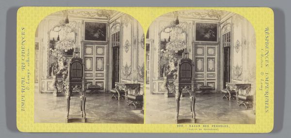 This is a stereoscopic photograph by Ernest Eléonor Pierre Lamy, capturing the interior of King Louis XV's chamber at the Palace of Versailles. The composition is structured by a play of light and shadow, emphasizing the room's elaborate ornamentation. The focal point is a sculptural equestrian figure which stands assertively atop a cubic plinth. The high contrast and monochromatic palette serve to highlight the textures and the interplay between hard, geometric forms and softer, organic details. The photograph's formal structure mirrors the hierarchical organization of the depicted space. The sculptor's technique creates a visual language of power and authority. Consider how the photograph invites us to reflect on the construction and representation of power through architectural and artistic forms. Ultimately, the photograph functions as a cultural artifact, documenting and interrogating the aesthetics and ideologies of its time. It prompts us to consider the ways in which space, objects, and images intersect to shape our understanding of history and authority.