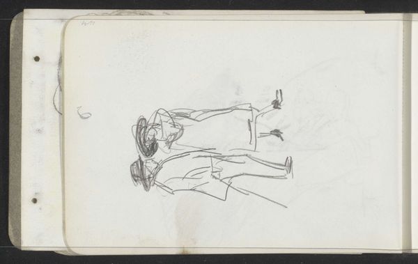 Curator: Here we have a pencil drawing by Isaac Israels, titled "Standing Woman," estimated to have been created between 1875 and 1934. It's currently part of the Rijksmuseum collection. Editor: Well, my first impression is that this sketch is incredibly ephemeral. The pencil lines are so light, almost hesitant. Curator: Indeed. This sketch offers an intimate glimpse into Israels’ working process, as we know he focused on capturing fleeting moments of modern life, often depicting women in contemporary settings. He's a known impressionist after all. Editor: Yes, and you can definitely see it here. It’s less about precise representation and more about conveying a sense of movement and light. Look at the way he suggests the form of the figure with such minimal detail. There is nothing academic about that approach; this is more personal. Curator: Right, this wasn't intended to be a finished work of art. These sketches, found within notebooks, were vital tools in his broader practice. The incomplete nature of this piece gives us insights into the aesthetic strategies he utilized, particularly his desire to capture his sensory impressions and ideas with swift, understated execution. The fact that these works exist within books indicates a direct link to an artistic evolution as it happened. Editor: The open space around the figure is just as important as the lines themselves. It creates a feeling of lightness and airiness that amplifies the delicate feeling, so a more involved drawing may ruin the image in itself. This balance in form and space speaks volumes. I imagine this was completed in mere seconds as someone just walked past. Curator: I completely agree. Israels was deeply embedded in the cultural currents of his time, moving within the cosmopolitan environments of Amsterdam, Paris and London, and he reflected those encounters within his artworks. This quick sketch showcases Israels' connection to the present, his interest in ordinary urban people and how social class mingled into urban daily life during this historical juncture. Editor: It’s a deceptively simple drawing that, the more I look at it, the more I find compelling. The restraint becomes almost monumental in its suggestion. Curator: Exactly, I find Israels' practice endlessly intriguing for what his works expose about the role of ordinary people in modernism's rise and expansion in Europe. Editor: I appreciate seeing how little is sometimes enough to communicate such profound artistic meaning.