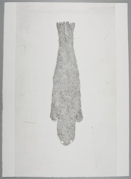 Editor: This is Kiki Smith's etching, "7 of 7 etchings in Portfolio: White Mammals." It's quite large, almost the size of a small rug. The image of the rabbit is haunting. What do you see in this piece? Curator: Smith's choice of the rabbit is fascinating. Throughout history, rabbits have been burdened with complex symbolism, often linked to fertility and vulnerability, but also witchcraft. Smith is reclaiming the symbol to challenge how marginalized bodies are represented. Editor: That's interesting. I didn't think of witchcraft. Curator: Consider her feminist perspective. How might the historical persecution of women, often framed as "animalistic," inform Smith's work here? It invites reflection on power, otherness, and embodied experience. Editor: I hadn't considered those connections. This gives me a lot to think about. Curator: Exactly, and that's the power of art, isn't it?
