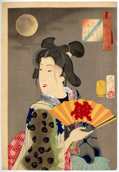 Editor: Here we have "Wanting to Meet Someone; A Courtesan of the Kaei Period," a woodblock print created in 1888 by Tsukioka Yoshitoshi. The falling cherry blossom motif gives it a very gentle, ephemeral feel. What captures your attention when you view this work? Curator: The striking geometry, first. The composition utilizes a fascinating contrast between rigid lines and soft, organic shapes. Note the severe, almost architectonic arrangement of the clothing, juxtaposed with the delicacy of the face and scattered blossoms. What purpose does that serve, aesthetically? Editor: That’s a very interesting point. I hadn't considered the geometrical aspect, I was drawn to the emotion first. It strikes me now as controlled; like the courtesan herself. Curator: Precisely. Now, consider the deployment of color. The intensity of the red, the deep indigo – observe how these hues define and confine, creating separate visual planes. What theoretical implications do these stark contrasts reveal in this configuration? Editor: The red and indigo do bring a sharpness to the overall effect, they almost appear as visual interruptions that enhance the other design. What stands out too, is the geometry in the indigo sections as well. The decorative approach seems intentional. Curator: Exactly. Yoshitoshi seems to explore and demonstrate the complex tensions between surface decoration and structural integrity. Are these elements successfully harmonized, in your estimation? Editor: Yes, definitely! Considering this as a portrait with decorative elements brings to life her emotion that I described in the beginning. Thanks to you, I better grasp the beauty and depth now. Curator: The exercise of perception refines appreciation, does it not? Thank you for the stimulating observation, It has expanded my perception also.