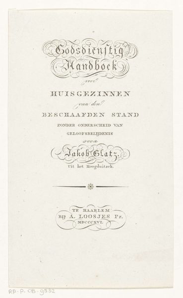 Curator: Looking at this, I’m immediately drawn to its formal austerity, its muted palette, and the stark functionality of the typography. Editor: Indeed. Here we have "Titelblad voor de Facsimile van de Unie van Brussel, 1577" created in 1827 by Daniël Abrahams. The work is an engraving, a print and features typography. Curator: So, the original document being a record of the Union of Brussels, signed in 1577, a pivotal moment where various provinces of the Netherlands united against Spanish rule. This title page, though produced centuries later, invites us to reflect on the legacies of colonialism and resistance. How did the printing itself mirror power dynamics? Editor: Good question. The medium speaks volumes: engraving. A labor-intensive process—each line meticulously etched—reflecting the slow, deliberate spread of information in a pre-digital age, where craft controlled what knowledge became available to the broader world, so what of the engraver's role? Curator: Well, Abrahams positions the making of this union, its potential strength, within a burgeoning nationalist sentiment that demanded to be remembered. His decision to present it with a Neoclassical design evokes a sense of historical legitimacy. It also participates in debates around how we visually construct and sustain national identity through printed materials. Editor: Yet, considering the political tumult surrounding the era of its making, does its creation itself mark labor relations amid a shifting social fabric and burgeoning printing industries? Did its distribution help spur political conversations around labor at all, however slightly? Curator: Yes, these printed texts were vital to creating a shared civic identity, and this craft process was at its core. But that identity was still limited and gendered; access was tied to both economic status and ideas regarding gender. Editor: I can certainly appreciate how viewing the print via these frameworks generates discussion about how materials themselves participate in making, unmaking, and negotiating ideas regarding nationality. Thank you for your perspectives! Curator: And thank you, because situating works of art such as this within broader socio-economic patterns reveals dynamics too easily passed over, granting the present an opportunity for necessary awareness.