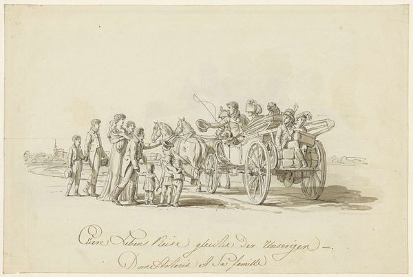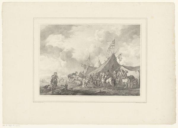 Editor: This is Jacques-Francois-Joseph Swebach’s "Plate XLVII," a drawing of what looks like a military encampment. The lines are so delicate, and the scene feels almost peaceful despite the subject matter. What stories do you think this image tells? Curator: This work speaks volumes about the lived experiences within military structures. The seeming peace you observe might be a veneer, masking the harsh realities of hierarchical power and potential violence inherent in such settings. Notice who is cooking, serving, and resting. How do these roles reflect gendered and class-based divisions within the military? Editor: It's true, there are definitely figures that seem to be performing very specific tasks. Curator: Exactly. Consider also the context of its creation. Was Swebach celebrating or critiquing the military? Understanding his positionality is key to deconstructing the image's potential ideological underpinnings. Editor: I hadn't considered the artist's intent beyond a simple depiction. It gives me a lot to think about! Curator: Indeed, questioning the artist's perspective helps us unravel the complex social dynamics represented.