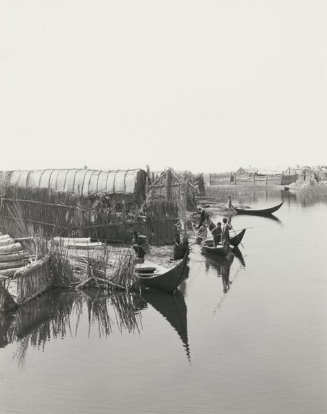 Ursula Schulz-Dornburg created this untitled photograph. The image, dominated by horizontal lines, features a vast expanse of water and sky, sandwiching dwellings that appear to float. The photograph's composition invites us to consider the relationship between architecture and its environment. The seemingly precarious structures challenge our notions of stability and permanence, unsettling conventional ideas about home and settlement. The high horizon line and muted tones emphasize the flatness of the landscape, creating a sense of isolation. The lone figure in a boat further accentuates the vastness and emptiness of the scene. Schulz-Dornburg has carefully framed this landscape, making us question the relationship between humanity and nature, and the very idea of inhabiting a space that seems so indifferent to human presence.