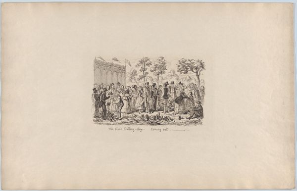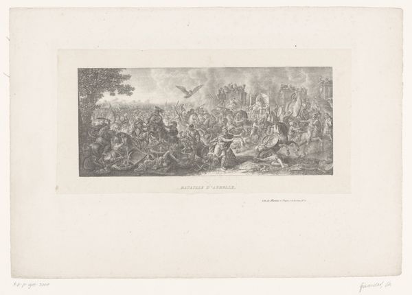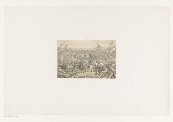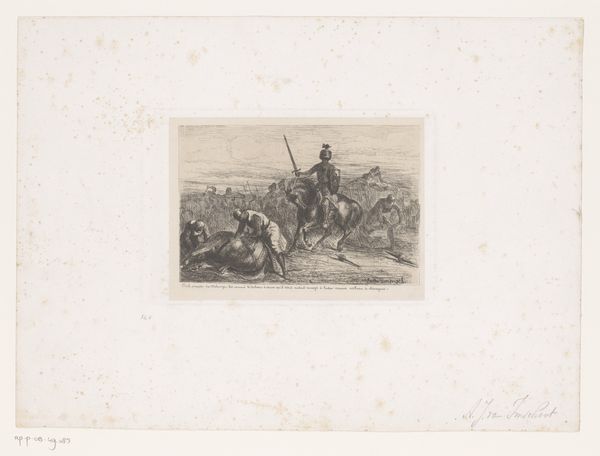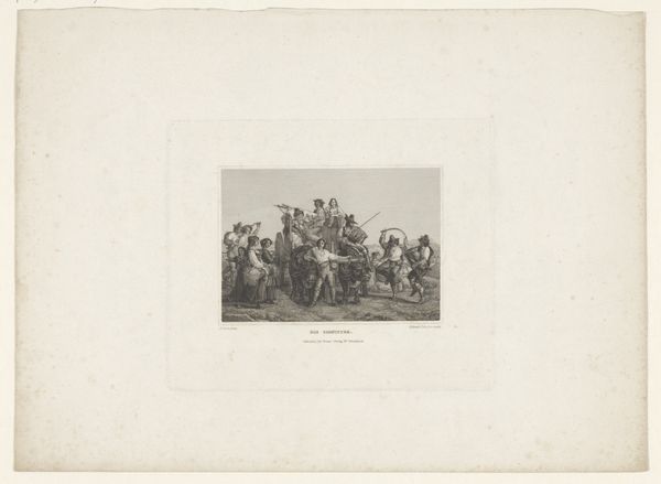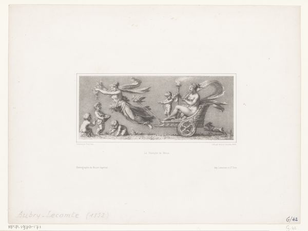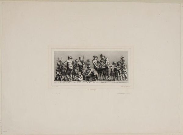 Hyacinthe Aubry-Lecomte created this artwork titled 'Oogst' using lithography. The central motif is the harvest, particularly of grapes, evoking Dionysian revelry and abundance. Observe the figures, both adults and cherubic children, actively engaged in gathering and offering the fruits of the vine. This scene echoes the classical theme of the 'putti,' winged infants often associated with love and abundance, seen in ancient Roman art. These figures resurface in Renaissance and Baroque art, evolving into symbols of innocence, divine love, and carefree joy. The act of harvesting itself, deeply embedded in human culture, transcends mere labor. It becomes a ritual, a celebration of nature’s bounty, and a communal act connecting generations. Such imagery triggers collective memories, resonating with primal, almost subconscious associations with nourishment and prosperity. This cyclical return to foundational symbols highlights the enduring human connection to the land, and the psychological comfort derived from these timeless images of plenty.