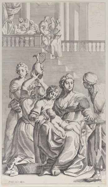Editor: Here we have John Flaxman's "The Judgment of Paris. Illustration to the Iliad," from 1795, rendered in ink on paper. It's a strikingly simple line drawing, very classical in style. I'm immediately drawn to the almost unsettling stillness, a kind of calm before the storm, knowing the implications of this seemingly innocent exchange. What do you see when you look at it? Curator: I'm captivated by the stark beauty of Flaxman's line work; it’s so direct, so uncluttered. You're right about the stillness, it feels pregnant with impending doom. Flaxman, working in the Neoclassical period, really strips away any excess, distilling the narrative to its purest form. It's as if he's inviting us to fill in the emotional blanks, isn't it? Editor: Absolutely. I was also struck by the contrast between the almost casual pose of Paris offering the apple, and the gravity of the moment. It feels so…understated. Curator: That's the beauty of it, isn't it? This understatedness throws the entire narrative weight on the viewer. There's Mercury lounging almost bored, a dog just observing without any clue of the catastrophic consequences; Cupid looking away disinterested; they add layers to our emotional engagement. Also, what do you make of Flaxman choosing to depict the goddesses without much in way of distinctive personality? Editor: It's curious, they seem like archetypes more than individuals. Almost like vessels for the ideas of beauty, power and wisdom rather than characters in themselves. Curator: Precisely. He emphasizes the abstract concepts they represent over any individual identity. Their motivations hardly seem important here, its the *act* itself which propels the tale to its terrible end. Flaxman reduces everything down to this single loaded moment. Editor: I never really considered how much the artist makes us active participants in completing the narrative. It is sparse, but its also rich. Thanks! Curator: And thank *you* for such astute observations. Thinking of narrative weight, visual choices...these prints continue to beguile!
