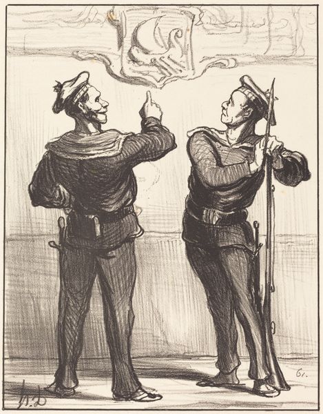 This lithograph, by Honoré Daumier, captures a pivotal moment in French history through the sharp eye of political satire. Dominating the scene is a hunter who stands triumphantly over the relics of past regimes. The dates strewn at his feet—1815, 1830, 1848—mark the fall of previous monarchies, each a failed attempt to restore the old order. The hunter, brandishing a rifle with a bird skewered at its end, embodies the relentless march of revolution. This image echoes ancient hunting rituals, where the slain animal represents the vanquished foe. Here, the dead bird becomes a potent symbol of dethroned power. Consider, also, how Daumier uses the motif of the museum, a place where the past is preserved and displayed. Here, the "Musée des Souverains" becomes a stage for the cyclical drama of power, a reminder that even the mightiest empires are destined to become artifacts of history. The psychological weight of this image is palpable, stirring collective memories and subconscious fears of instability and change.