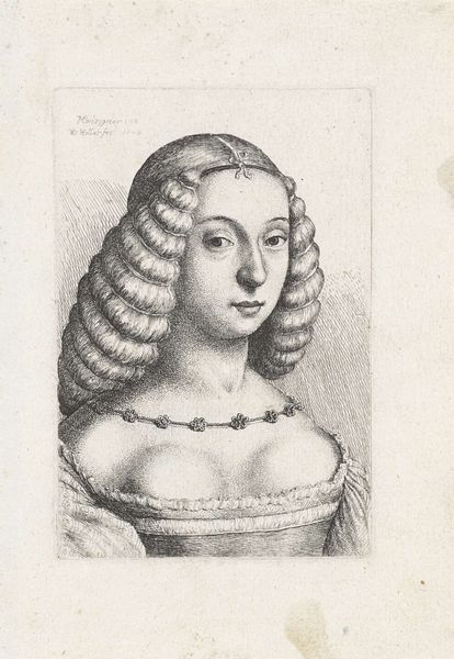 Curator: Standing here before "Portret van een jonge vrouw met haarnet", dating from 1645, created by Wenceslaus Hollar. It is held at the Rijksmuseum, a delicate engraving on paper. What strikes you first? Editor: Her calm, direct gaze. It's almost unsettling. She looks so composed, even though the medium, engraving, seems to imply precision, and maybe even restraint. Curator: The gaze is captivating. Hairnets during this period symbolized modesty and virtue. A marker of social status but also personal character. What psychological weight does the simple inclusion of the net introduce, do you think? Editor: It suggests confinement, both physically and perhaps metaphorically, a very typical depiction of womanhood during the baroque, which also brings out the theme of freedom that this engraving defies with that look... though I can't help but wonder if there was any irony in her situation? Curator: Indeed. But see also how Hollar meticulously renders the textures – the intricate pattern on her dress, the delicate curls escaping the net. It speaks to the era's appreciation for detail, but is that all it does? Editor: For sure. And all those lines to create this subtle shade of her skin... such a statement. The Baroque thrived on intricate design, mirroring a desire for ornamentation but also of deeper emotional undercurrents. To me the print encapsulates that tension. Curator: Precisely. And while Hollar made many such portraits, the symbols in the visual space and subtle inflections, imbue it with timeless relevance about women's identities across time. Editor: I agree. It seems, that across centuries, some silent dialogues—or silent portrayals as this—stay perpetually present. A reminder of shared histories, and subtle battles of expression. Curator: Indeed. What an enlightening consideration. Editor: Gladly. It was quite thought provoking indeed.