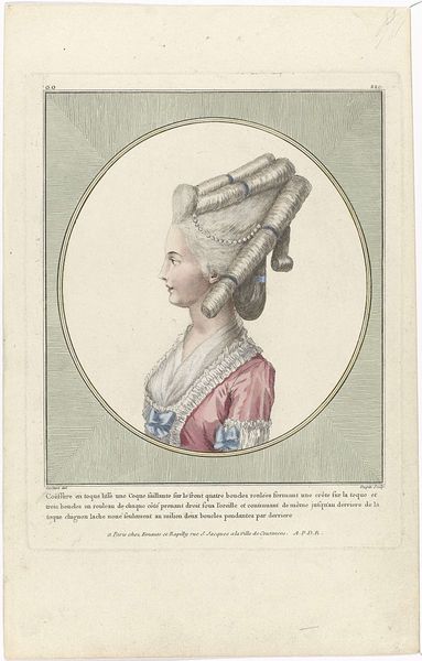 Curator: Well hello there! Editor: We're looking at "Gallerie des Modes et Costumes Français, 1781, oo 218 : Coeffure Nouvelle le devant (...)" by Pierre Adrien Le Beau. It’s a print made with aquatint and watercolor. The subject is a woman with an absolutely extravagant hairstyle. What strikes me is how delicately it’s rendered, almost like a whisper from the past. How do you interpret this work? Curator: Whisper is perfect! For me, it’s all about capturing a moment, an ephemeral trend. It feels like stepping into a Parisian fashion magazine of the 1780s, doesn't it? These prints weren't just art; they were a record of aspiration. And that hairstyle, good heavens! It’s a whole landscape on her head! I mean, can you imagine carrying that around all day? What do you suppose it says about the status of the wearer? Editor: Definitely, It screams status and access! But looking at her face, she doesn't seem joyful but…almost burdened? Like she is forced to wear such a huge “landscape.” Curator: Good eye. Perhaps it shows the price of beauty and staying "on top of fashion". Now I wonder what was *in* the hair? Certainly not just hairspray and hopes... Editor: Ah, that makes you wonder! This piece made me think about the strange weight of beauty standards. I initially saw a pretty print, but it has now layers of status and criticism to me. Thank you for guiding me through! Curator: And for me, it highlighted the fleeting nature of fashion and the power it holds over us. An excellent observation from you today, dear!