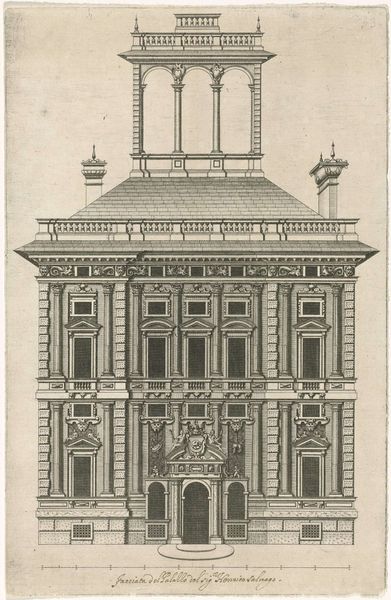 Nicolaes Ryckmans' Palazzo Cattaneo Adorno is an architectural study rendered with ink on paper. The drawing presents a symmetrical elevation of a grand building, dominated by repetitive windows and decorative elements that evoke both the classical and baroque periods. The building is divided into horizontal registers. Each level exhibits a rhythmic series of windows separated by pilasters and ornamental panels. This structured organization provides a visual language to understanding the architectural intent and its formal ambition. The stark monochromatic palette emphasizes the geometric precision and surface details. Note the chimneys which punctuate the roofline. Ryckmans masterfully conveys volume and depth, using the limited tonality to describe the interplay of light and shadow. The rigid symmetry coupled with decorative excess offers a semiotic field ripe for interpretation. The building’s façade becomes a sign, reflecting the values and aesthetics of its time. The Palazzo Cattaneo Adorno is an exploration of form, line, and the capacity of architectural drawing to embody ideas.