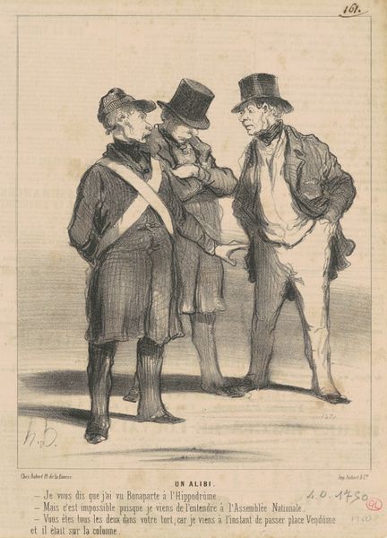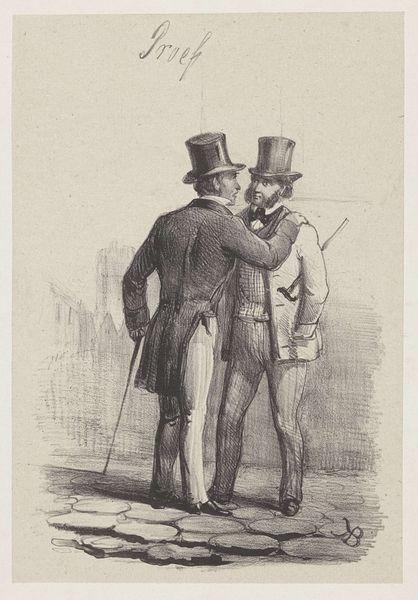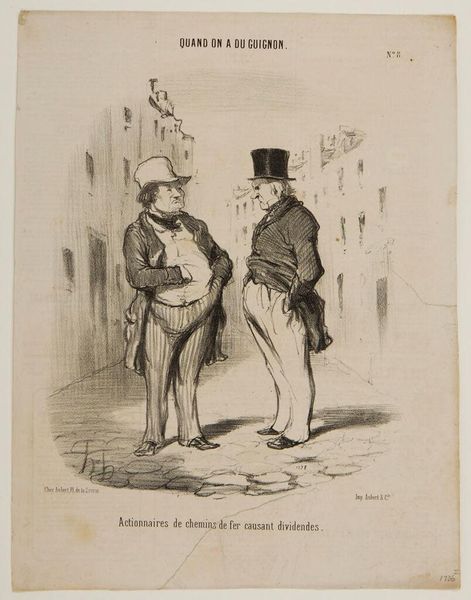 Honoré Daumier created this lithograph, "Un Jour de Grande Tenue," using lines to define form and shadow. The composition immediately draws attention to the contrast between the two figures. Daumier masterfully employs caricature to critique the pomposity of military figures. The stark contrast in stature and expression between the two men serves as a visual commentary on social hierarchies and individual vanity. The corpulent officer on the right, with his exaggerated features and self-important salute, stands in contrast to the leaner, more reserved figure beside him. The cross-hatching in the lithographic technique, mimics the visual weight and texture. Note how Daumier uses line to create volume and texture, particularly in the rendering of the uniforms. Through this formal approach, Daumier’s critique extends beyond mere political satire. It questions the very structures of power and representation. The artwork leaves us pondering the relationship between appearance and reality, and the ways in which society constructs its figures of authority.