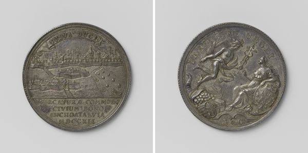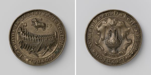 This is a gilded bronze guild badge made by an anonymous artist representing the shoemakers, tanners and leather sellers guild of Middleburg. The symmetrical composition is immediately striking. Observe how the circular form is neatly divided into distinct fields, separated by an inscription that acts as both a border and a linguistic signifier. On one side, a crowned boot sits prominently, flanked by the number '70' and '86', perhaps indicators of membership or a significant date. On the reverse, tools of the leather trade are neatly arrayed. The linear precision and careful arrangement of symbols don't just denote the guild's identity, they also serve as a structural framework, asserting authority and stability. The arrangement of objects are designed to convey order and tradition. This piece functions as a semiotic device, communicating complex social and economic relationships through simple, legible forms.