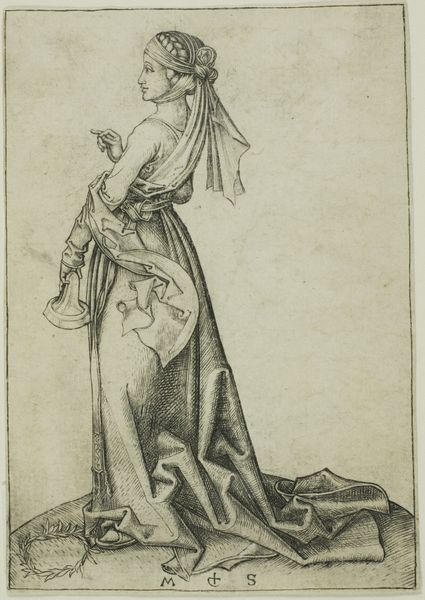 Curator: We’re looking at "The Fourth Wise Virgin", an engraving of undetermined date, by Martin Schongauer, held here at the Art Institute of Chicago. Editor: There’s a melancholic grace about her, don't you think? The figure seems to float, as if barely tethered to the earth. That long, flowing garment enhances the ethereal feeling. Curator: Absolutely. It’s typical of Schongauer’s printmaking style—exquisite detail achieved through precise lines on the plate. The subject is, of course, derived from the Parable of the Ten Virgins, which became a hugely popular subject for Northern artists. It's likely the image was reproduced extensively, thus shaping religious sensibilities. Editor: What strikes me is how individualized she is. Even though she’s part of a larger narrative, there’s a deep sense of personal contemplation in her gaze. What do you make of her vessel with the burning flame? Curator: The flame she holds, seemingly within a type of goblet, is vital. These images usually functioned Didactically – the burning flame being symbolic of faith. Editor: The folds and drapery…the incredible texture created on paper through the engraving technique...it transforms the allegorical into something touchingly human, even. It pulls me into a story I only vaguely understand. Curator: I think that points to the brilliance of printmaking at the time. It democratized art, even if those reproductions carried with them a deeply religious message or served other powerful interests of the Church or rising merchant classes. Editor: And the medium, print, gave it reach! It also strikes me that with Schongauer’s distinctive signature inscribed, each print itself becomes an emblem of value. Even today! I almost feel that melancholy starting to wear off, by the way. It's like I, too, am carrying the torch now. Curator: That’s wonderfully said. And it's an apt summary of the layered and enduring appeal of works like this. Editor: Absolutely. What a striking woman.