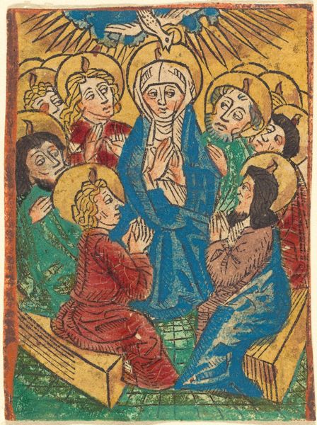 Curator: Looking at this print, “Christ Bearing the Cross,” dating back to around 1490, likely produced by an anonymous artist, the stark colors against the roughness of the printmaking give it a really raw feel. What stands out to you initially? Editor: Agony. Pure, unadulterated agony etched into Christ’s face and mirrored in the almost grotesque features of the jeering crowd. It feels intensely personal, less about religious dogma and more about human suffering. Curator: The suffering is absolutely central. It's a key symbol here. The cross, the blood—they're potent reminders of Christ's sacrifice, obviously, but notice the expressions of the figures. We have that stark contrast, don't we, between the empathetic faces around Christ and the jeering tormentor. Consider, though, what it represents in the collective unconscious, that idea of persecution and unjust suffering echoing across cultures and throughout history. Editor: Precisely. It becomes a mirror reflecting all those times when power grinds down the powerless. The blue-clad figures to Christ's right, the empathetic ones... their presence adds a bittersweet chord. Even in this theater of cruelty, there's still…pity? Or at least, human recognition. I find myself drawn to their faces more than the central figure even. They are witnessing an injustice, helpless to change the situation. Curator: It makes you question the whole nature of spectatorship, doesn't it? To witness something horrible and feel powerless to intervene. It speaks to a very basic human tension. And the print itself, the medium... it’s so basic, direct, that almost rough feel intensifies that primal emotional connection. This wasn't intended for the elite. Editor: Exactly. It’s designed to punch you right in the gut. There’s no distancing, no layers of abstraction to hide behind. You are confronted, point blank, with the harsh reality. So it is accessible in more ways than one, a potent reminder that even the grandest narratives boil down to the deeply human level. It stays with you. Curator: Absolutely, it's about communal experience of sorrow, pity, injustice. I agree. What stays with me the most is its accessibility—the message cuts right through time. Editor: It feels, oddly enough, relevant. That timeless, heartbreaking truth – those blue clad witnesses. Human connection somehow survives even the worst moments. I’ll carry that thought for a while, I think.