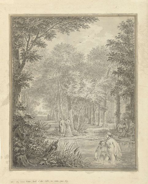 Curator: This watercolor drawing, titled "A Wooded Path at Treslong, near Hillegom", was created in 1789 by Jurriaan Andriessen. It's interesting how plein-air techniques are captured. What's your initial impression? Editor: It feels incredibly peaceful, almost hushed. Like that moment just before the rain when the world seems to hold its breath. The misty atmosphere, combined with the lone figure, definitely sets a melancholic tone. Curator: The romanticism really comes through, doesn't it? And given that Andriessen was working during a period of immense social and political upheaval across Europe, it raises some questions about escapism and the relationship between the individual and nature. Was this an attempt to create an idyllic scene distanced from the realities of society at the time? Editor: Absolutely! There is something comforting about the soft edges and blurry foliage that speaks of longing for a simpler time. Makes me want to grab my walking stick and join that red-coated character lurking beside the trees. He’s either enjoying the landscape or waiting to ambush someone—or both. Curator: Indeed. Also, notice how the path bisects the composition, leading our eye deeper into the wooded area. Considering ideas around constructed landscapes and nature as refuge during moments of societal instability might unlock further insights here. How might such artworks have impacted 18th-century understandings of the Dutch countryside? Editor: Good point! Now I am considering the use of color to convey feeling: there's an almost monochromatic range here, broken only by the solitary spot of red on the coat. It really makes you think of this person as existing in another reality or a sort of fairytale setting. Curator: Those color choices—primarily blues, greens, and grays—certainly enhance the atmosphere and draw out specific emotions related to being alone, maybe some even stemming from class-based divides or inequalities... Editor: Okay, I can get behind that—now, finally, it feels less like an 18th-century landscape and more like a story that’s being revealed to me—both romantic, perhaps, but also charged. Curator: Well, I appreciate how the conversation unfolded here, illuminating our personal encounters. It brings important attention to this piece, which I hope will create new questions around 18th century drawings for others to enjoy. Editor: Likewise. I look forward to the next conversation that helps reframe an artwork for modern perspectives. Thanks.