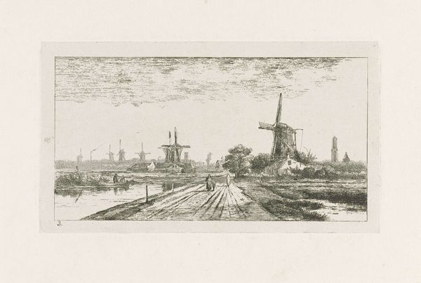 Eberhard Cornelis Rahms made this etching of windmills at Willeskop in the Netherlands. The cultural significance of windmills in 19th century Holland is immense. These structures were not just machines; they were symbols of Dutch ingenuity and the ongoing battle against the sea. Windmills like these shaped the landscape and the economy. They were crucial for drainage, allowing the Dutch to reclaim and cultivate low-lying areas. They also powered industries like milling grain and sawing wood. The presence of windmills often dictated settlement patterns and trade routes. In a way, they were essential for Dutch survival and prosperity. The precise lines of the etching highlight the relationship between the Dutch and their environment, which you can research further in archives and historical societies. Recognizing this context allows us to interpret the artwork not only as a landscape, but as a visual document of a culture defined by its relationship with nature and technology.