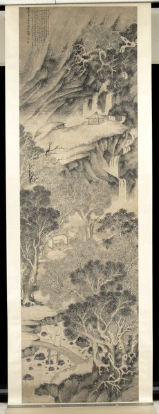 Editor: This ink painting, "Landscape with Pines in the Manner of Wang Hui," is attributed to Okada Hankō around the 19th century. The meticulous brushstrokes depicting the trees and mountains are incredible. It almost feels like a stage set. What can you tell me about how it's put together? Curator: This work offers an interesting insight into the artist's labor and materials. Note the deliberate choices of ink density and brushstroke; how do they serve not just representation, but also tactile engagement with the paper's surface? Consider too how the "Manner of Wang Hui" invokes a specific artistic lineage. It suggests that skill is not solely about individual talent but also about adherence to certain production methods. Editor: So, you're saying the "manner" isn't just about style but a commitment to specific labor practices, as well? The use of ink here really emphasizes this careful and perhaps disciplined style. Curator: Exactly! This invokes the role of the artist, their workshop system, and even the specific tools employed – the types of brushes, inkstones, and the sourcing of paper. These details shape our understanding of value. We can also speculate about who commissioned this work, considering their socioeconomic status and appreciation for such displays of practiced skill. Does that add to how you view the piece now? Editor: I think it gives context to why an artist would so carefully adhere to certain traditional means, thinking of the patron and marketplace definitely adds new dimension. Curator: And perhaps this also challenges any romantic notion of artistic genius! We see an integration of artistic expression within established systems of patronage, labor, and production. Editor: That’s fascinating! It encourages you to think of artistic skill more like craftsmanship, and less like innate talent. I will definitely reflect more on the production of the art. Curator: Indeed! Materiality invites us to critically examine what we consume and the value we assign to these creations.
