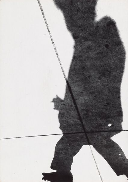 Editor: Here we have Marvin Newman's "Shadow, Chicago," a photograph taken in 1951. It's a high contrast image, almost entirely black and white, depicting exactly what the title says: a shadow. It's such a simple, stark composition. I am intrigued by its abstract form despite being something so ordinary as a shadow. How do you interpret this work? Art Historian: What grabs me immediately is how the artist utilizes shadow, something ephemeral, as the primary subject. Shadows inherently possess a psychological weight – they represent the unseen, the subconscious. Think of Plato’s Allegory of the Cave, shadows distort perception and challenge reality. Here, what is highlighted – or rather, shadowed – hints at more than it shows. What narratives might this evoke in you? Editor: It does create a sense of mystery. It seems the shadow belongs to a figure in a hat and coat... but the form is blurry, lacking detail. It becomes more about suggestion than a clear representation. Art Historian: Precisely. And in obscuring details, the photograph transcends simply documenting a person’s shadow. It explores themes of anonymity, the individual lost within the urban landscape. In post-war America, that sense of identity was both celebrated and challenged by social pressures. Do you see any evidence of those tensions within the composition itself? Editor: Now that you mention it, yes! The harsh lines crossing the frame disrupt the figure, creating a sense of unease or constraint. Also, there is a strange shape on its chest. It kind of diminishes this person... it is strangely poetic. Art Historian: Indeed. This makes you ponder, doesn't it? It's as if Newman captured a fleeting moment not just of light and shadow, but of cultural anxieties, individual agency within larger social structures. It prompts us to think about the interplay between identity and environment. Editor: I see it differently now. It is not merely an aesthetic capture; there is a depth I initially missed. Thank you! Art Historian: My pleasure. Art is about peeling back layers and seeing how imagery echoes our collective memory and individual experiences.