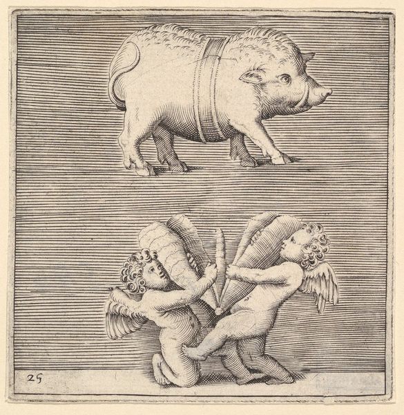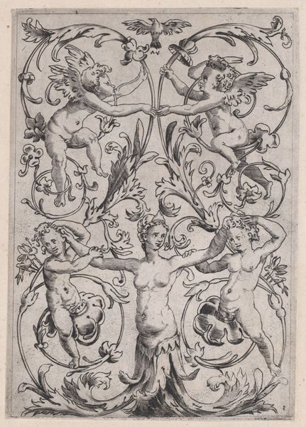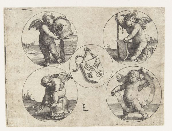 Curator: This engraving, titled "Two Cupids in Two Circles," was created around 1517 by Lucas van Leyden. It's a remarkable example of Northern Renaissance printmaking. My first impression is how playful it appears, but almost unnervingly so. Editor: Playful, yes, but I’m more intrigued by the process. Consider the technical skill involved in creating these miniature scenes on a metal plate and reproducing them. The tooling, the inking, the pressure—it speaks to a sophisticated workshop practice. It makes me wonder who these prints were made for, and who was consuming them? Curator: The market for prints in the 16th century was fascinating. They were relatively affordable, which democratized access to imagery and knowledge. I think the allegory of the piece speaks to social relationships of love, perhaps as commissioned work intended for wedding or engagements announcements for certain noble families. The image has love and marriage central as two parts of it. Editor: I'd consider the material. These prints were not meant to be singular pieces, and rather, items with different commercial uses. I think the social implication comes from their material and dissemination processes. These engravings democratized the act of collecting for merchant classes interested in engaging art consumption to better align themselves with upper classes, through prints, heraldry and announcements. Curator: Certainly, there's a relationship to the wider context. And within this little frame we're discussing, that juxtaposition comes alive; what’s striking is to see the love portrayed here in action, in real and idealized manners that come together from those two realms that you described. The contrast contributes to the social significance of the overall work. Editor: I see what you mean; it goes back to the print production and consumption then. Curator: Indeed. So, considering that aspect that is so central to what is displayed, one can better explore the context from where it stems. Editor: This piece, it seems, acts as a lens through which we can examine both the production and reception of art, shedding light on the evolving dynamics of the art market in the Renaissance. Curator: Exactly, and also, our own approaches to how we view works within different interpretive prisms.