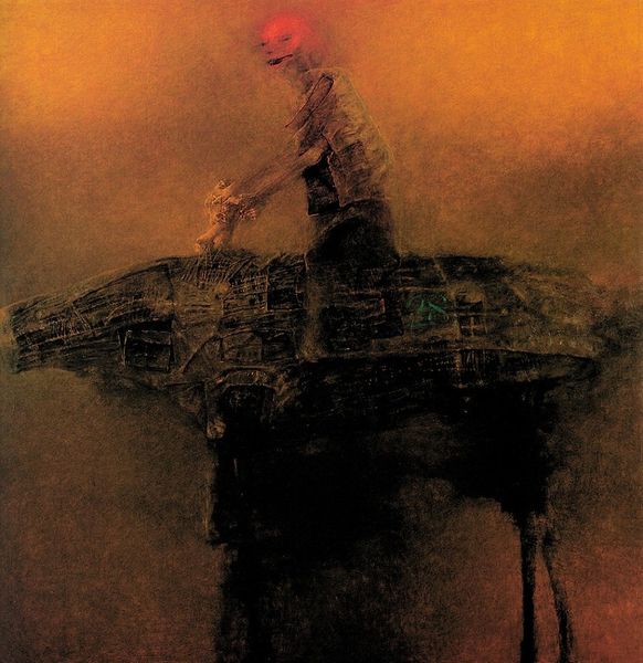 Curator: Here we have an untitled work by Zdzisław Beksiński, completed in 1976 using oil and acrylic on canvas. Editor: Stark! It hits you immediately with a somber weight. The muted reds and browns create such a heavy, oppressive atmosphere. Curator: Oppressive is definitely one word for it. I see echoes of post-war anxieties, especially considering Beksiński's upbringing in Poland amidst conflict and political turmoil. These recurring themes in his work of isolation, decay, and the body represent broader sociopolitical unrest. Editor: Absolutely. Look at the symbolism: The ambiguous figure shrouded in cloth, the cross barely visible, and those dark, orb-like shapes hanging within. They evoke burial shrouds, lost souls and perhaps obscured visions of the future, or memories from the past. It's as though the artist is attempting to visualize some type of collective, cultural trauma through those potent images. Curator: And that is precisely how Beksiński was interpreting it—a deeply personal, but also universally relatable sense of dread and unease during tumultuous historical changes. Remember that, although it appears allegorical, the artist actively resisted imposing symbolic narratives on the work. He claimed the meaning lay purely within the aesthetic experience of the piece, not some external interpretive structure. Editor: But can the image escape history? The visual language it uses draws directly from symbolic traditions, whether intentionally or not. Think of the orb or the sphere—historically a symbol of wholeness and completeness. In Beksiński’s rendering it almost feels inverted, decayed. He's subverting our expectations. Curator: That friction is essential. Beksiński resisted aligning with any formal movements or established modes of interpretation, preferring to explore subjective emotional expression. To truly unpack his work we have to analyze how individual expression clashes with established order. Editor: Precisely. Regardless of intention, the image reverberates with a haunting meditation on memory and the burden of history. It urges a powerful dialogue between our contemporary understanding of trauma and the cultural memory etched in symbolism. Curator: I think you have hit on the precise crux. Beksiński compels us to look both inward at our fears, and outwards towards the societies that may engender them. Editor: I agree; what lingers isn't just the darkness, but also the quiet courage it takes to confront it, rendered with stark precision in every single shade.