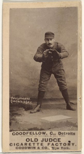 This albumen silver print of Augustus Peter "Gus" Alberts, a shortstop for Milwaukee, was produced around 1888 by Goodwin & Company as part of their "Old Judge Cigarettes" series. These cards were not conceived as art, but rather as promotional items included in cigarette packs. The image, with its sepia tones, provides insight into the cultural landscape of late 19th-century America, a period marked by the rise of consumer culture and the increasing popularity of baseball. By associating their product with a baseball player, Goodwin & Co. tapped into the emerging cult of celebrity and the growing enthusiasm for the sport. The institutional history here is key. The image's existence is tied to the marketing strategies of a tobacco company and the growth of professional sports. Understanding this context requires us to look at economic, social, and cultural forces beyond the realm of art. Further research into the history of baseball cards and tobacco advertising would shed more light on its cultural significance.