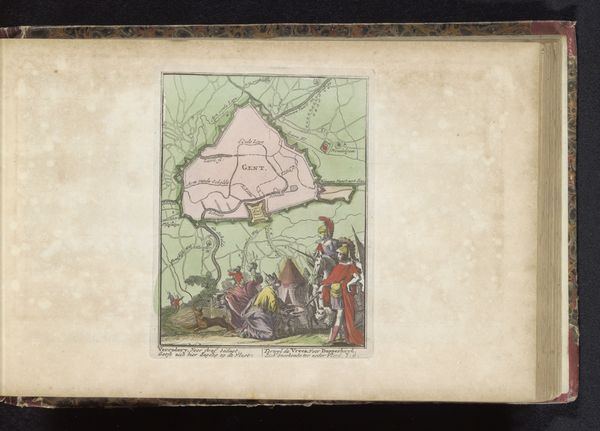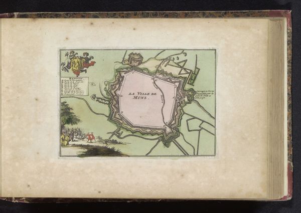 Curator: Let’s examine this fascinating print entitled *Beleg van Ath, 1706*, a historical landscape rendering from around 1735 by an anonymous artist. It seems to employ both drawing and printmaking techniques with paper, watercolor, and perhaps colored pencil, capturing a military siege. What are your initial impressions? Editor: Immediately, I see the city itself rendered almost like a fortress of the mind—rigid geometry contrasting with the seemingly chaotic flurry of human activity around it. There's a real tension here. The red flags and splashes suggest urgency and conflict. Curator: Indeed. The strategic depiction of Ath is rendered almost abstractly, yet it highlights the role of cartography in military campaigns. During this era, images of sieges weren't just about aesthetics; they were vital documentation used to disseminate information. This print serves as a potent form of propaganda. Editor: The lower part, though, draws my eye to the cluster of figures—the artist seems concerned with the human drama. There is a visual imbalance between the rigid precision of the fortress layout above, with its symbolic walls of protection and regimentation, versus the seemingly chaotic nature of military conflicts portrayed in miniature down below. The siege works both on an earthly, representational scale, but also serves as a larger symbol of cultural fortification against exterior "threats" and societal destabilization. Curator: I agree. We must consider how the Dutch Republic perceived itself through images like these, especially with this almost "clinical" yet propagandistic portrayal. It provided a clear "us versus them" mentality during periods of prolonged European conflict. The anonymous nature of the print speaks to how such images circulated widely and shaped popular opinion. Editor: So, this artwork acts almost like a dreamscape of conflict; a marriage between emotional narrative and cultural history painted by the unknown experiences that hide behind those fortified fortress walls. This interplay leaves me wondering what kind of cultural dialogue can emerge through periods of intense crisis like these. Curator: Looking closely reminds me how constructed collective memory can be, especially during wartime, influencing our reading of maps and motives in present and future conflicts. Editor: Yes. Seeing that combination is surprisingly thought-provoking—bringing forth dialogue in many directions on an emotional level and through a much wider historical, cultural context.