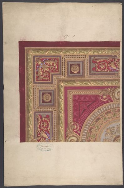 Editor: We're looking at "Designs for Ceiling and Wall Decoration for Monsieur Lecomte de la Grange" from, give or take, the late 1800s, by Jules-Edmond-Charles Lachaise. It's a watercolor and print piece. What strikes me is the sort of reserved elegance, almost like a whisper of opulence, contained in those carefully laid lines. What do you notice when you see this? Curator: Funny you say "whisper," because the watercolor reminds me of secrets held within grand halls. Think of those 19th-century salons, bursting with ideas, conspiracies brewing beneath crystal chandeliers. Lachaise’s design, isn’t just decorative; it's aspirational. The geometric precision suggests order, control, a very Neoclassical yearning for ideal beauty. Notice how the light would play across the ceiling's central medallion – imagine being lost in thought under it! What do you make of that contrast, the cool geometry and the almost dizzying detail within? Editor: I suppose it's like wanting both structure and ornamentation—taming chaos with calculation, almost a yearning to organize the beautiful mess of life. What are the colors symbolizing? Curator: The muted blues and reds? For me, they evoke a sense of faded grandeur, memory itself becoming tinged with nostalgia. This piece exists in a space *between* architectural plan and artistic reverie. Imagine these colours gently aging, becoming more and more like whispers of the past. What feeling does *that* idea give you? Editor: Something melancholic, like seeing a ghost of its former self. All those lavish parties and intense conversations hinted at! Curator: Exactly! That very melancholy, the awareness of time's passage, is itself a kind of beauty, don’t you think? It reframes our view of beauty altogether. Editor: Absolutely. I initially only saw lines and patterns, now there are rooms, voices, and echoes... a narrative I would have missed completely without this. Curator: The best art invites you to imagine the world into being. It's a collaborative endeavor!