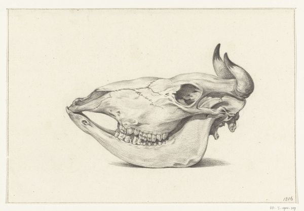 Curator: This hauntingly beautiful piece is called "Dyrekranie med horn," which translates to "Animal Skull with Horns." It was created sometime between 1849 and 1879. Editor: The texture jumps out immediately! There's an almost tactile quality to the lines, making the bone look both fragile and enduring. Curator: Precisely. Its classical realism is conveyed through precise engraving techniques, isn't it? Notice how the engraver uses varied line weights and cross-hatching to achieve a sense of depth and chiaroscuro, almost sculpting the form from the blank page. The lines build the mass, the form, in its most academic reading. Editor: Yes, but let's also consider the labor involved in such intricate work. The process itself—the countless hours spent etching and refining—adds another layer of meaning, doesn't it? This skull was observed but the print also became its own material thing, through intense labor and skill, like a highly wrought tool, ready to serve some educative or moral aim. Curator: Certainly. One can view the meticulousness as elevating it from mere study to art. There is this quality of *vanitas* to it too, don't you think? A meditation on form, but also on the temporality that the physical material of both bone and the engraving plate implies. Editor: The *vanitas* theme absolutely resonates, particularly when we think of the paper it is printed on, a mass produced product, connecting high art with more commonplace practices. The materiality and manufacture suggests that while the subject deals with death, the artwork engages with broader social processes. Curator: Well said. The artist utilizes a fairly standard technique in service of a complex formal exercise, drawing attention to the very artifice involved. The bones articulate, they exist as marks, strokes, and a sophisticated build up of line and tone that describes depth in a flattened plane. Editor: The economic factors also impact interpretation; considering access to tools, training, and materials opens up possibilities for further reading that simply regarding aesthetic appreciation overlooks. Curator: Indeed, by considering its formal elegance as a result of specific historical and material circumstances we see more than just the beauty but also the context within which that beauty was wrought. Editor: An engaging exploration of life and death then, made manifest through exacting skill.