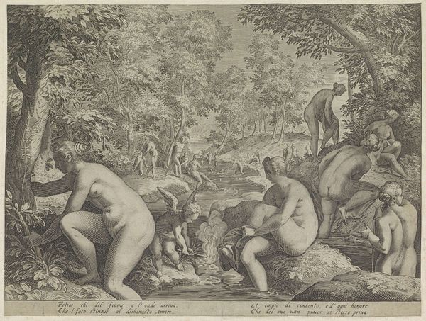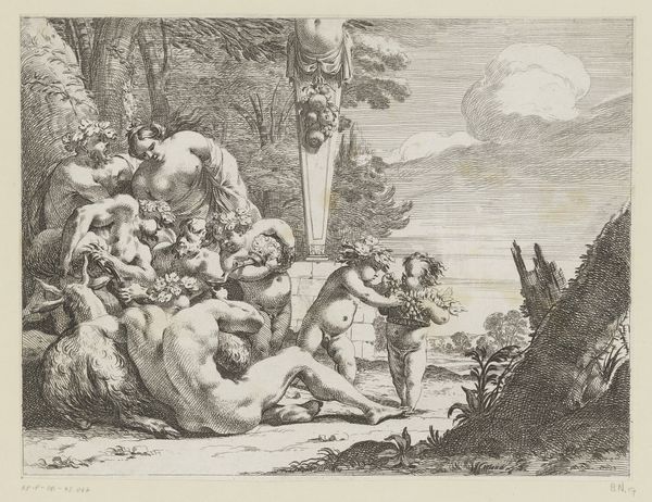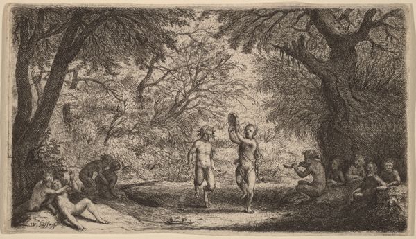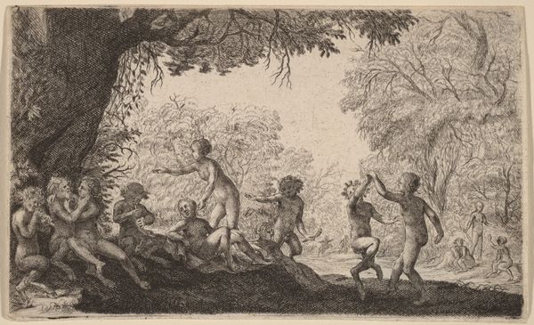 Erasmus Quellinus made this pen and brown ink drawing called, 'Four Dancing Children (Bacchantes) and Two Making Music,' in the 17th century. During this period, the Dutch Golden Age, artists were actively imagining and depicting the world of the ancient classical past. Here, Quellinus presents us with children embodying the Bacchantes, followers of Bacchus, the god of wine, fertility, and theatre. These Bacchantes appear to be in the throes of ecstatic revelry, embracing a freedom that perhaps adults of the time could only dream of. The themes of classical mythology allowed artists to explore the ideas of freedom, joy, and uninhibited expression, offering an alternative to the more rigid social norms. Imagine the feeling of liberation Quellinus might have been channeling, or perhaps critiquing, through his depiction of children abandoning themselves to the intoxicating rhythm of life. How does this image challenge or affirm societal expectations around childhood, gender, and pleasure?