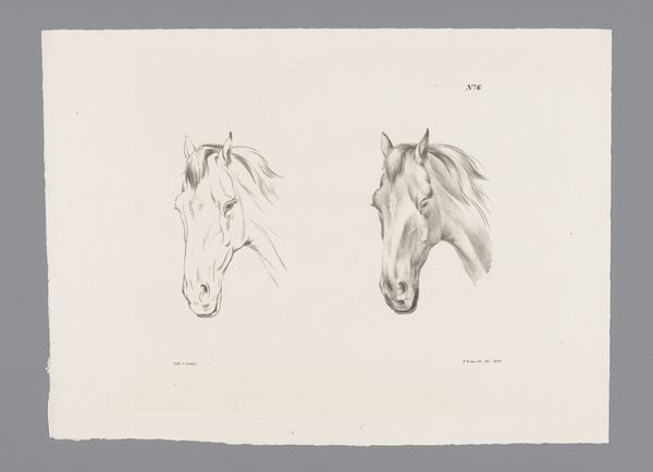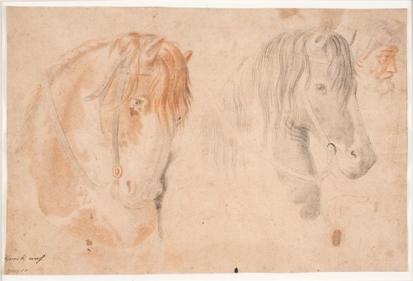 Curator: Here we have Jacobus Cornelis Gaal's "Two Horses' Heads," created around 1851. It's a detailed pencil and graphite drawing, a study in animal portraiture now residing in the Rijksmuseum. Editor: They’re beautiful. There’s something almost melancholic about their eyes. A somber elegance. Curator: Considering the context, horses were deeply embedded in 19th-century Dutch society, essential for agriculture, transport, and even military power. Gaal was actively participating in artistic life: he was member of several artist societies and regularly part of exhibitions in Amsterdam and The Hague, the artistic and political canters. He painted horses quite often. These detailed depictions were quite popular. Editor: It’s interesting how Gaal captures the texture of their coats. The clear, fine pencil work suggests it was made quite meticulously, not just sketching, reflecting a slow, intentional study of his subject. The subtle shifts in value must have required quite a bit of material skill to achieve. The means of their breeding would determine not only physical appearance, but the jobs they'd fulfill in Dutch society. I wonder if there were local types of horses at the time... Curator: The market for genre paintings that celebrated the Dutch countryside increased steadily in that period. Rural life became idealized in painting. Horses of course had a clear function and often a high economic value. So indeed, here, it is interesting how class relations extend even to the animal kingdom. I think those images have an incredible ideological influence even until today. Editor: Yes, there’s a tension there. He immortalizes the labor that’s been put to use, but it's divorced from its own conditions. Look at the material choices, that very restrained use of shading – a real mastery of tonal variation, very delicate graphite handling here. A drawing instead of a painting would serve very practical, pedagogical reasons, which again makes the process very accessible. Curator: He's capturing a kind of working-class aristocracy, elevating the status of farm animals... In art, the portrayal of animals reflects social values, too, and Gaal very explicitly contributes to constructing a national identity by using specifically 'Dutch' scenery and people. Editor: Yes, precisely. Gaal isn’t just portraying horses, he is representing labor relations as idealized subject. The making and looking at such image is also labor: someone buying the product from the work of art... It’s all embedded in this network of artistic patronage and consumption. Well, this was very insightful! Curator: Agreed. It makes one think about our own preconceived notions of this animal that the modern global equestrian industry keeps recreating everyday.