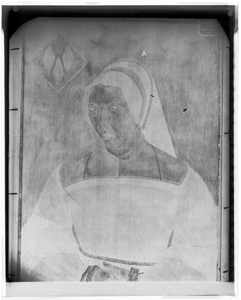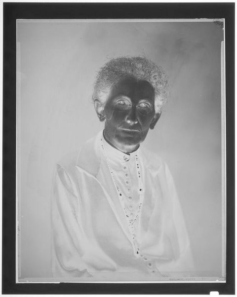 Curator: This is an untitled portrait of a bride by John Howell, housed here at the Harvard Art Museums. It's a silver gelatin print, measuring about 5 by 4 inches. Editor: Striking! The inverted tones create a ghostly, almost ethereal quality. The delicate fabric drapes beautifully, forming a complex interplay of light and shadow. Curator: Indeed. The image, in its negative form, offers an intriguing look at bridal symbolism. The white, traditionally representing purity, is now darkened, potentially suggesting a more nuanced view of marriage. Editor: I'm drawn to the composition itself. The subject's gaze, slightly averted, and the soft focus lend a dreamlike, almost unsettling mood. It begs interpretation through a psychological lens. Curator: I agree. Her averted gaze and the inversion of light play with our expectations, challenging the conventional, idealized representation of brides. It makes us question what marriage meant for the woman pictured. Editor: The negative space and stark contrast emphasize the subject's features, imbuing her with an almost otherworldly beauty that's hard to ignore. A successful disruption of the norm.