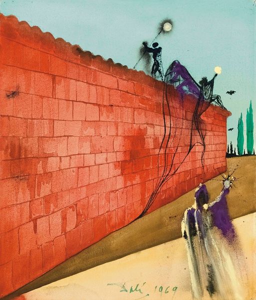 Curator: Here we see "Over the Caspian Sea" by Tahir Salahov, an oil painting created in 1961. What's your immediate take on it? Editor: Bleak, and strangely beautiful. The steely grays and blues give a real sense of industrial isolation. It almost feels like a scene from a dystopian film. Curator: The limited color palette is quite striking, isn't it? Note the touches of red at the base of the pilings, a symbolic flicker of hope against the overwhelming gray. Editor: Or a marker of the corrosion eating away at the structure. Considering this was painted during the Soviet era, do you think it's a critique of the dehumanizing effects of industrial labor? The figures look so small and anonymous. Curator: That’s an interesting reading. One might consider it not merely a critique, but more so an ambiguous statement, perhaps hinting at the individual’s insignificance within a vast, impersonal system, yet suggesting something quite grand about the system itself. The cityscape, stark as it is, feels enduring and powerful. Editor: Right, because these paintings from the Soviet era are rarely overt about their political messaging. Instead, we get these muted suggestions, images ripe for multiple interpretations, about what it means to live under such a regime. Also the Helicopter at the top, maybe indicates of social mobility ? Curator: A fleeting hope soaring amidst the grim reality. Speaking of movement, did you notice that there seems to be a recurring emphasis on diagonals? From the clouds above to the structural steel—they all imply motion. I find myself asking whether it represents a progression, or perhaps disruption and instability. Editor: The whole painting feels unbalanced and unsettling. Thinking about identity, gender, race...who are these workers? What are their lives like? Are they choosing this life or being forced to? The lack of specifics creates an almost universal image of workers lost to progress. Curator: These questions become particularly pointed considering Salahov's position within Soviet art. In many ways, this canvas exists to transcend a simple, didactic story and move us into an aesthetic of emotional response. The landscape's sheer atmospheric density provokes a psychological tension. Editor: I’m still stuck on the faces of these workers: they can be literally anyone... They become cyphers within a system, stand-ins for a larger historical force. Curator: Yes. And while their story is shrouded in mist, Salahov manages to tell us something very intimate about their perseverance in the face of unrelenting modernity. Editor: So perhaps it’s not just bleakness we’re seeing but also a quiet defiance, then. Food for thought!