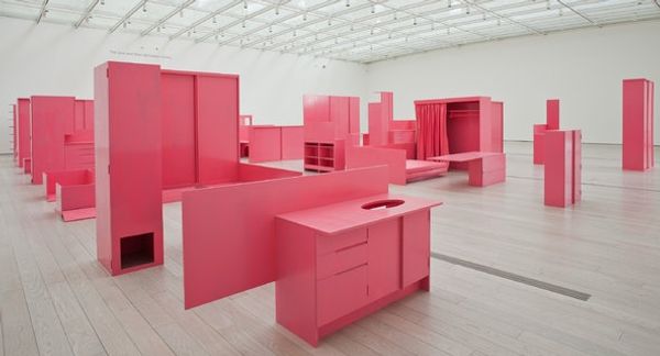 Curator: Looking at Jessica Stockholder’s large-scale mixed media installation, created in 2000 and titled “Vortex in the Play of Theatre with Real Passion: In Memory of Kay Stockholder,” I’m immediately struck by how boldly it disrupts the gallery's usual calm. Editor: Absolutely! The playful use of color and materials—like stacked shipping containers and swathes of painted fabric—creates an almost carnival-like atmosphere, jarring against the refined architectural setting. Curator: Stockholder’s work is really about challenging our understanding of space and form. She appropriates everyday objects, often mass-produced, and uses them to construct these vibrant, immersive environments. It's a deliberate move against traditional sculptural conventions. We have to consider this piece as a powerful critique of consumerism. Editor: Right, it's a Postmodernist commentary on how consumer goods can be recontextualized and repurposed. But beyond that, the "Vortex" part of the title hints at something deeper. Is there a sense of the destabilization that loss can bring, remembering Kay Stockholder. Curator: I agree, and that reading is quite consistent. The piece becomes a memorial of sorts. The chaotic arrangement might echo the disruption grief causes to conventional structure, social interaction, familial connection, as the passion of emotion intersects with the theatre of everyday performance. Editor: It makes you wonder about the role of art institutions, doesn’t it? Housing such disruptive works; turning potentially anarchic energies into something museum visitors safely interact with and depart. Curator: Exactly. There’s an inherent tension between the rebellious nature of Stockholder's art and the institutional context it now inhabits. The containers, suggestive of global trade and movement, are now still, framed by white walls and architectural decorum. Editor: Reflecting upon the title once more, it’s hard not to interpret how the theatrical setting of the museum transforms and subsumes an individual experience with loss and emotion into the public sphere. The title and composition together really draw attention to the way art serves a political role for society as a whole. Curator: I concur! It has been incredibly illuminating to discuss this. Hopefully, listeners come away from it also having new questions about its role.