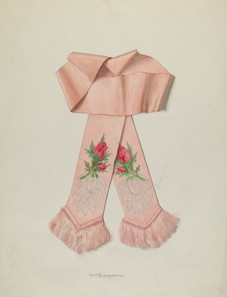 Curator: This is "Mittens" by Archie Thompson, made sometime between 1935 and 1942, a watercolor and pencil drawing. What are your initial thoughts? Editor: They look so warm! Not just physically—they give off a cozy feeling. Like Grandma's about to send you off to play in the snow, but first, a cup of something hot, you know? It's the red, maybe? Curator: Yes, red is a strong color that speaks to winter activities, warmth and holidays, a popular decorative hue, and these mittens evoke a very specific time. This was a period of significant social and economic change. I wonder how clothing items such as these played into that landscape. Editor: Hmm, like were they homemade as a necessity, a symbol of simpler times people wanted to cling to? That floral design looks pretty detailed—somebody put real love into stitching that. Do you think that craftsmanship represented a sort of defiance, an insistence on beauty during hardship? Curator: Precisely! Think about the broader context, the rise of consumerism. These handmade items gain a certain cultural significance. Perhaps a silent protest against mass production or a way for artists to reclaim traditional art skills to respond to such movements? Editor: Maybe they just kept little fingers from freezing, but now you've got me thinking! Look at how the color shifts on the wool—Archie Thompson was paying attention. Watercolor usually isn't so opaque, so it has to be layers of drawing and paint—wonder how long it took him to build this up. You see how this technique and the care given can be interpreted as quiet rebellion, especially given the period. It's more than mittens. Curator: Exactly. These mittens are transformed from functional object into a representation of a particular cultural narrative. Art transforms mundane items, challenging norms. Editor: So much weight on a pair of painted mittens. Who knew? Still, warm thoughts prevail—they did the work of protecting vulnerable hands, of sparking memories and representing cultural values. What else could mittens ask for? Curator: True, a very hopeful work, made all the more powerful when framed by its historical setting. It seems simplicity is complexity's greatest disguise.