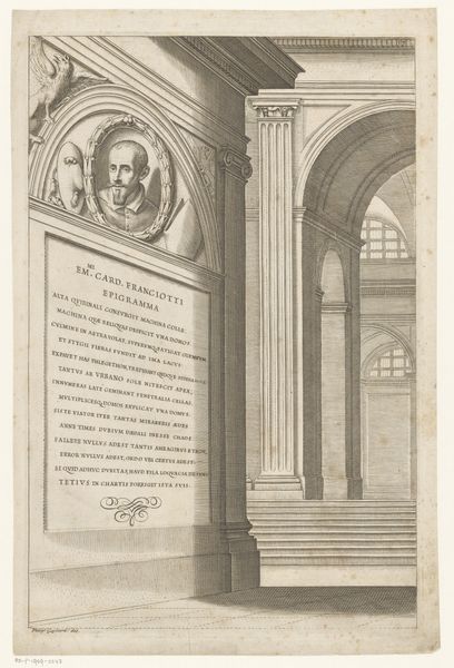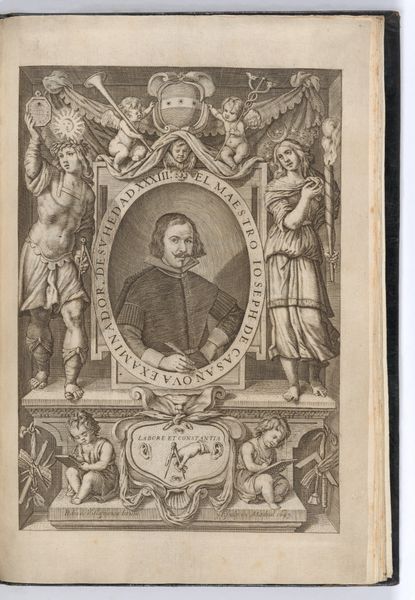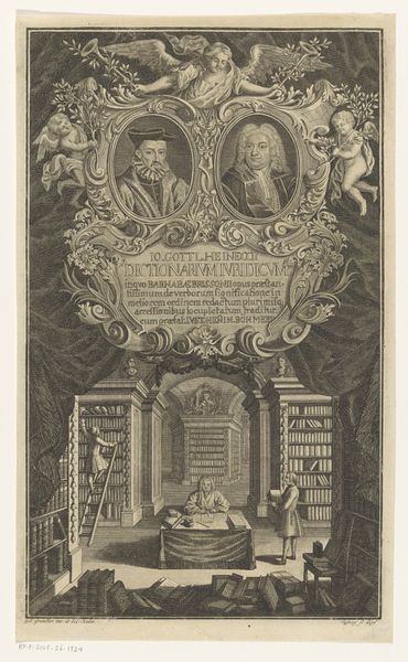 This undated print portrays Scipione Gentili, likely made posthumously. Its visual structure is dominated by the symmetrical arrangement of figures and architectural elements, creating a balanced yet complex composition. The portrait of Gentili is framed by an oval and flanked by cherubs, which draws the eye upwards. Below, an elaborate depiction of a library, complete with scholars and towering shelves, suggests a world of intellectual pursuit. The use of linear perspective creates depth, inviting the viewer into this space of learning. Consider the semiotic weight of the library itself: a symbol of knowledge, order, and civilization. Yet, the presence of figures reaching for books on ladders hints at the potential inaccessibility or the challenging pursuit of knowledge. This tension between order and the effort to acquire knowledge destabilizes any singular interpretation. The print's formal qualities—its balance, depth, and symbolic elements—encourage viewers to reflect on the structures that frame our understanding of knowledge and the figures who inhabit those structures.