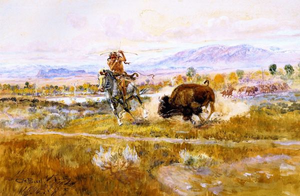 Curator: "The Buffalo Hunt" is an 1895 oil on canvas by Charles M. Russell depicting a scene of Indigenous hunters pursuing bison. What are your initial thoughts? Editor: My immediate response is one of intense energy and implied violence. The diagonal composition throws us right into the heart of a chaotic, high-stakes hunt. Curator: Precisely. Russell’s paintings weren’t simply romantic portrayals of the West; they are embedded within the complex narrative of Indigenous erasure. What is visible but not explicitly said here? Editor: Definitely. You're looking at not just a genre scene of a hunt, but a socio-political statement—at a time when the buffalo population was decimated and Native American ways of life were under direct threat by the US government. It prompts difficult discussions about agency, resilience, and survival under systemic oppression. How complicit was Russell in this cultural shift? Curator: Russell himself lived and worked amongst the tribes of Montana. Yet, he simultaneously profited off imagery rooted in romanticism and stereotypes for a consumer market in the East. The composition's dynamism might unconsciously echo the colonial thirst for acquisition and conquest. Editor: I see that perspective. This image contributes to a narrative – albeit one of respect in Russell’s view - that the white man, at least indirectly, understood or had claim over the ways and spaces of native culture. This piece raises ethical questions about cultural appropriation and the depiction of vulnerable groups. Are we appreciating, or fetishizing? Curator: Indeed, are we historicizing and contextualizing in a way that allows visitors to think critically about whose stories are privileged? Or are we simply perpetuating a history written from a position of power? The power of art lies in its ability to spark debate and challenge our preconceived notions, not merely confirm them. Editor: Exactly, and this painting invites us to consider that complex relationship—between history, art, and social change—a vital interrogation of historical depictions, especially when they involve communities that were—and still are—fighting for self-representation. Curator: Absolutely, a crucial conversation when we explore the historical and social contexts in paintings like "The Buffalo Hunt" here. Editor: An absolutely critical consideration for all art.
