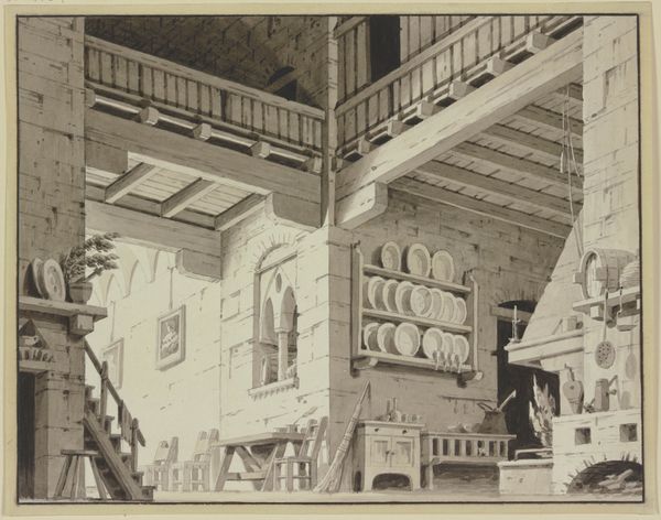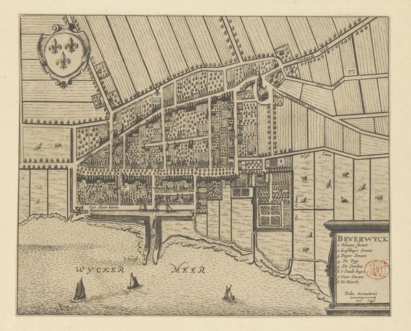 Curator: This is a drawing from 1888 entitled "Interieurontwerp voor een zwembad aan de Marnixstraat en Leidsekade in Amsterdam" - "Interior design for a swimming pool on Marnixstraat and Leidsekade in Amsterdam." It's an ink drawing, showcasing architectural ideas, and to me, it feels incredibly detailed for a proposed design. What do you see in it? Editor: Well, it definitely feels like an imagined space. There are so many different perspectives packed into a single image! It almost feels like the artist is trying to show the building from all possible angles. I’m curious, as a formalist, how you interpret the overall composition and the relationship between the various architectural elements in this drawing. Curator: Note the repetition of linear elements and geometric forms. The structure is composed of rectangles and arches, and each small vignettes is framed and set apart, much like different stages of a play. Do you notice any intentional contrasts in the linework that draw your eye? Editor: I see that. The central pool is framed with very thin, light lines which makes the more detailed and heavily-inked dressing rooms in the lower register really pop. And it also makes the leaves framing the edges appear to draw one's gaze back into the design, and back into the architecture itself. It feels like the artist uses framing to emphasize both the scope of the entire structure and how humans may interact with it. Curator: Precisely. One might also contemplate the visual language being used to communicate an entirely new type of experience at that time. The drawing becomes not merely a representation, but a visual argument for how these design elements coalesce to create something that never before existed. How does that effect how you consider it as art, as opposed to architectural plans? Editor: That makes a lot of sense. I was so focused on it as a blueprint, but now I see how the design and composition work together to argue for this modern recreational space! I've definitely learned a new way to appreciate architectural drawings.