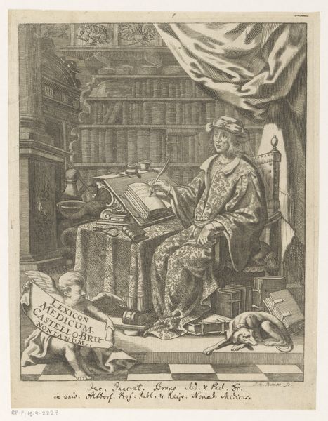 Curator: Adriaen Matham, likely sometime between 1610 and 1660, rendered this intriguing scene, "Dr. Faust in zijn studeervertrek." The piece, utilizing ink and charcoal, now resides at the Rijksmuseum. Editor: Okay, immediately, I get a vibe. It’s got this hushed, almost secretive quality. All that earthy sepia ink... and the composition—stuffed! You feel like you're peering into somebody's chaotic, fascinating mind. Curator: Chaotic indeed, and rich with context! Faust, a figure synonymous with the perils of forbidden knowledge, and of patriarchal power. Look at the clutter around him: alchemical vials, texts, and tellingly, a skull—alluding to mortality and the futility of earthly pursuits. And the monkey! The stereotypical symbol of base human instincts and mockery of human intellect! The figure of Faust isn't just some guy in a room—he is knowledge becoming monstrous because of an unrestrained ego and drive to transgress ethical limits. Editor: Yeah, the monkey. Is he…mocking Faust? Judging him? Or just plain bored? He's got that "waiting for a banana" look, like even cosmic horror gets tedious after a while. It feels really Baroque; the textures are wonderfully rendered and dramatic, right? But it all creates this rather stifling sense of being caught up in… well, a story gone wrong. Like a spell cast too late. The image is very baroque and at the same time almost expressionistic, the old sage seems perturbed and disturbed... Curator: The Baroque sensibility is evident, but also there is a hint of what we now consider Romanticism! You see this in his almost defeated body language. I think this is about so much more than just knowledge. This artwork is so incredibly haunting precisely because we witness the effects of an individualistic drive divorced from its communal ties. He seems genuinely burdened by his pursuit. Editor: Right? It’s not triumphant or powerful—it’s heavy. Like he’s made a terrible bargain and now all the books in the world won’t save him. Makes you wonder if enlightenment's really all it's cracked up to be sometimes. Thank you for highlighting how gender, identity and societal values all contribute to the creation of such an expressive, and disturbing portrait of unfulfilled intellect! Curator: And it also makes you ask at whose expense is this knowledge acquired? Glad we got to contemplate Matham's drawing! It reminds us that art from the past can ignite very contemporary debates and conversations.