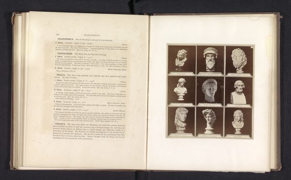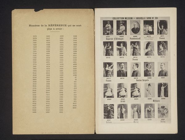 This photogravure by Nadar presents twenty portraits of actresses, including Emma Eames, Jeanne Demarsy, and Francine Decroza. The composition is a grid, each portrait a small window into the sitter’s persona, rendered in soft sepia tones. The arrangement encourages us to consider the individual within the collective. Nadar, a pioneer in photography, challenges the traditional portraiture of painting by exploring reproducibility and seriality. This grid format, reminiscent of scientific classification, invites a structuralist reading. Each image, a signifier, contributes to a larger structure that reflects early photographic techniques. Consider how Nadar's process destabilizes the notion of a unique, authentic image. Through the formal constraint of the grid, Nadar investigates photography’s capacity to both document and categorize. This work serves as a discourse on the nature of representation itself.