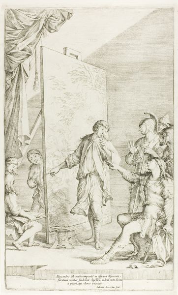 Editor: This is "Spotprent op de mislukte ballonvaart van Miolan en Janinet," a print etched in ink, created anonymously in 1784. It’s held at the Rijksmuseum. It looks satirical. What kind of message do you see in the symbols used? Curator: Ah, a very insightful question! Note the visual tension. The portraits haloed by clouds suggest ambition and enlightenment ideals. But above, the words "Abaissez et non montez" – Descend, do not ascend – already hints at Icarus’s folly, right? The donkey – the animal counterpart to the flying Pegasus– kicking its hooves up reinforces this. Do you notice anything about the dress and carriage of the central figure? Editor: Yes, he's burdened, isn't he? The empty balloon being dragged…he looks more like a prisoner than a pioneer. Curator: Exactly. It subverts the heroic narrative. Think about the dog, cats, and birdcage abandoned; consider those once thought vital to the ascension now relegated as burdensome luggage. It questions the hubris of the Enlightenment – do you agree? Editor: Absolutely. The animals symbolize things left behind, casting a light on how new innovations don’t always improve life, but leave debris and destruction, literally and metaphorically. Curator: Precisely. Consider how the balloon itself, representing human aspiration, is depicted partially deflated. It makes one consider where human knowledge and science fit within larger society, or if we even consider this at all. Editor: I never thought of prints being so complex. It makes me realize there is often more than one story being told simultaneously. Thanks for sharing that, this has been enlightening, even the visual cues can tell stories within stories.