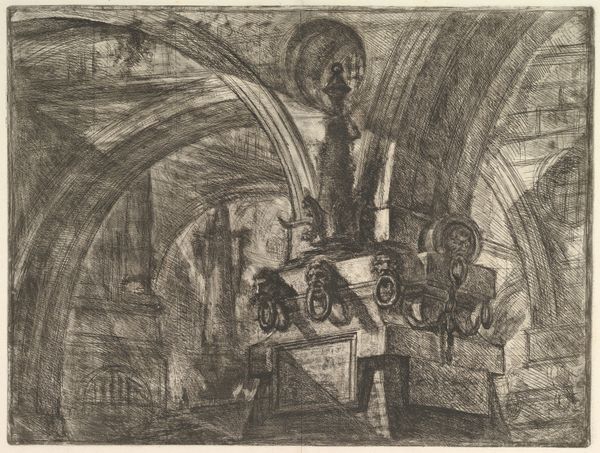 Curator: Immediately, I'm struck by a sense of confinement. The heavy linework and oppressive architecture press in. Editor: We're looking at "The Smoking Fire" from Giovanni Battista Piranesi's "Carceri d'invenzione," or "Imaginary Prisons" series, crafted between 1744 and 1755. This print, a combination of etching and engraving, currently resides at the Metropolitan Museum of Art. Curator: Prisons indeed! Look at the dizzying array of arches and staircases, the oppressive weight of the imagined architecture. What kind of symbols were at play here? Editor: Piranesi masterfully utilizes classical motifs. However, he distorts and exaggerates them to evoke a sense of unease. Consider how the architectural elements of antiquity usually represented order, power, and civic virtue are turned into something monstrous and chaotic. There's a sense of perpetual incompleteness. Curator: And the fire… not a comforting hearth, but an ominous presence. The wisps of smoke rising throughout suggests industry and possible decay. It's not about literal imprisonment, but psychological torment, surely? Editor: Precisely! The "Carceri" are viewed as allegories of the mind, reflecting a state of anxiety. Piranesi, as an artist deeply connected to both Venice and Rome, expresses perhaps anxieties relating to his own personal and professional ambitions within shifting artistic tastes, patronage, and the grand institutions that governed the lives of artists in that time. Curator: I suppose his work stands as a powerful testament to art's capacity to express disquiet. This isn’t merely a cityscape; it's a mental landscape, reflecting humanity's capacity for self-imprisonment through ambition or doubt. Editor: True, a disturbing look at how ambition, power and legacy, might ultimately lead one down a rabbit hole.
