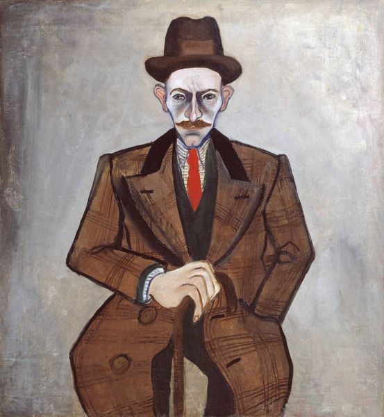 Editor: This is Max Beckmann's "Self-Portrait in Blue Jacket" from 1950, rendered in oil paint. There's a compelling directness to his gaze, and that blue is so striking. How do you interpret this work, especially considering the time it was made? Curator: Well, given the socio-political context of 1950, just after the Second World War, and Beckmann's personal experience fleeing Nazi Germany, this self-portrait reads as an assertion of identity amidst a world in turmoil. The blue jacket, almost aggressively bright, could be seen as a statement of defiance. Editor: Defiance, really? Curator: Yes, but not necessarily in a loud or demonstrative way. More subtly. Consider how self-portraits function within the art market. They are commodities that grant artists a degree of autonomy and allow them to represent themselves on their own terms. How else does the setting shape the work? Editor: He seems somewhat enclosed, perched. The limited color palette, the compressed space, does create a sense of unease or constraint, as if he’s trapped in his own representation. I initially thought that maybe he was depressed? Curator: Interesting! While that reading is perfectly valid, thinking about Beckmann's place in society at the time provides another compelling interpretation. His experiences undoubtedly shaped how he perceived himself and how he wanted to be seen, and furthermore how the art market or the institution of museums might affect that! Editor: So, beyond personal expression, it's a statement about artistic independence and self-preservation in a fractured world? Curator: Precisely. Beckmann used his self-portrait to control his image, asserting agency within complex social and economic systems. A valuable point I have realised! Editor: That provides such a valuable perspective that I did not consider when I looked at it originally! I suppose there’s always a complex history embedded within art, regardless of style.