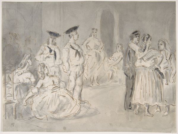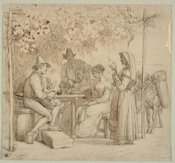 Henry Moses made this print, "Tea Time," sometime in the early 19th century. The sepia tones and delicate lines create a scene of understated elegance. The formal arrangement of figures around a central table is carefully balanced, evoking a sense of calm. The use of line in this print is particularly striking. Moses employs a network of fine strokes to define forms and create subtle gradations of light and shadow. This technique, typical of etching, endows the scene with a tactile quality, inviting the viewer to explore the textures of clothing, furniture, and foliage. The structured composition, with its clear division of space and carefully placed figures, is also worth noting. The artist uses a semiotic language to communicate social order and decorum, conveying a sense of refinement that reflects the values of the era. The print’s emphasis on line, coupled with the restrained palette, functions not only aesthetically but also as part of a larger cultural discourse on taste and propriety.