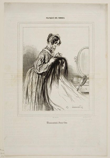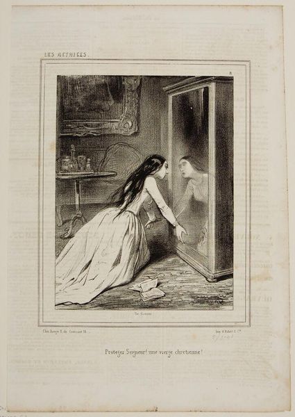 Curator: Here we see a lithograph by Paul Gavarni, a French artist born in 1804, titled "In rehearsal: There you are at last, a monster wallowing in sin." Editor: It’s quite striking. The heavy lines create a sense of unease. The figure seems burdened, almost trapped, by her surroundings. Curator: Gavarni was known for depicting Parisian life, often focusing on the lives of actors and performers, and the print's title and the presence of what looks like a theatrical prop suggest commentary on performance and perhaps its moral implications. Editor: I'm fascinated by the material conditions suggested here. The cheapness of print allows wider consumption of images and ideas, but does it also cheapen the subject, turning this actress's emotional labor into a commodity? Curator: The image reflects prevailing social anxieties about the role of women in the arts and the potential for moral corruption within the theater. Editor: An interesting tension between the actress's supposed sinfulness and the labor of artistic expression, brought into being through the materiality of the lithographic process. Curator: Indeed. Gavarni invites us to consider the complex relationship between art, morality, and social perception. Editor: A potent reminder that what we consume as art is itself a product of labor, context, and often, conflict.