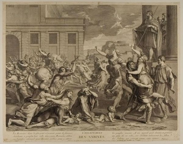 Curator: Louis Desplaces created this engraving, "The Triumph of Titus and Vespasian." The sheet measures approximately 45 by 59 centimeters and resides at the Harvard Art Museums. Editor: It feels like a very staged depiction of power, almost suffocatingly celebratory. The tight composition certainly adds to that feeling. Curator: Engravings like this were widely disseminated; consider the labor involved in producing multiple impressions and how that labor connects to the glorification of imperial power. Editor: Absolutely. Note the angel crowning Titus—a clear symbol of divine right, reinforcing the emperors’ authority. It is a well-worn image, but effective propaganda. Curator: Indeed, Desplaces’ choice of engraving allowed this message to reach a broad audience, shaping perceptions of Roman leadership throughout Europe. The materiality of the print itself aided its message. Editor: It is a fascinating combination of artistic skill employed for political ends. The symbols are so overt! Curator: It serves as a poignant reminder of how art has been used to manufacture consent and uphold power. Editor: Leaving us to consider how those images persist.