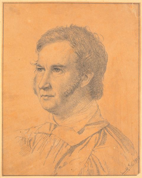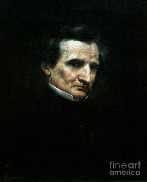 Curator: Here we have Gustave Courbet's 1850 oil painting, "Portrait of the Composer Hector Berlioz." Editor: My first impression is the somber tone, the way the subject emerges from near darkness. The values seem so tightly controlled, giving it a very serious mood. Curator: Considering Berlioz's revolutionary impact on Romantic music, this gravity seems appropriate. Courbet was, after all, deeply invested in representing his contemporaries and challenging academic art. How does the portrait speak to Romanticism or even the nascent Realism movement in painting? Editor: You can certainly see Romanticism in the dramatic lighting and emotional intensity. Look at the way light models Berlioz’s face, particularly the intensity around his eyes and forehead. And the dark background serves to isolate him, which emphasizes his individual genius. However, the blunt honesty and lack of idealization point to Realism. It's a really interesting tension. Curator: Absolutely. Think about the social context of mid-19th century Paris. Berlioz was known for pushing boundaries. Do you think Courbet captures that rebellious spirit or, more likely, chooses to portray his artistic persona? Editor: That’s a key question. Courbet captures his physiognomy faithfully, but it also projects a persona of intellectual depth. Consider the stark contrast between the light falling on his face and the obscured lower half of the composition. Is that an intellectual aura around the man? It’s really a masterful arrangement of light and shadow. Curator: His intense gaze does demand attention, a challenge, perhaps? This painting stands as both a historical record of a significant cultural figure and a commentary on the shifting artistic landscape. Editor: Indeed. The nuances in composition are effective at conveying so much more than simply a record of Berlioz's appearance, something beyond objective representation. Curator: It provides a snapshot of an individual but, also, reflects on larger socio-political dialogues happening at that time. Editor: A fascinating example of art’s capacity to capture not just a likeness, but the weight of a historical moment through visual strategies.