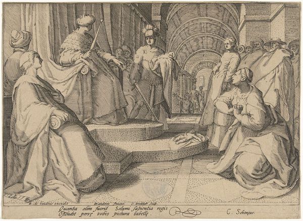 Curator: This engraving, "Josef van Arimatea verzoekt Pilatus om het lichaam van Christus," which translates to Joseph of Arimathea asking Pilate for the body of Christ, was created by Philips Galle between 1585 and 1586. It’s currently held here at the Rijksmuseum. Editor: It has a solemn, almost stark feel to it. The detail achieved through engraving is really striking. The rigid, formal architecture contrasts with the fluid, almost pleading gestures of the figures. Curator: Absolutely. Galle was a master printmaker and publisher, and this work demonstrates the influence of academic art and the Baroque style that was emerging at the time. Think about the Counter-Reformation and how artists were trying to connect with viewers on an emotional level, emphasizing biblical narratives. How do we read this power dynamic depicted between Joseph, who seeks compassion, versus Pilate? Editor: Right. Pilate's ambivalence is so palpable. He almost seems detached, even as he presides over this monumental request. It really brings to mind contemporary conversations around the intersection of faith and power, specifically how political figures grapple with moral decisions, especially when there is religious implication for an already oppressed and persecuted group. Curator: That’s a very insightful connection. Consider too that engravings like this played a vital role in disseminating imagery across Europe. Galle's workshop was incredibly prolific; these images were consumed, copied, and adapted, impacting how biblical stories were visualized and understood by diverse audiences. This engraving wasn't just art; it was a tool of cultural influence, a reinforcement of social expectations, especially concerning religion and politics. Editor: And we see this artistic reinforcement play out even today, just on different media platforms. By bringing light to works such as these, we further invite folks to critically reflect upon how our culture evolved based upon these visual narratives. Curator: Precisely. This single engraving offers a portal into understanding the art, the culture and the complicated sociopolitical backdrop of the 16th century, themes which continue to hold meaning and presence today. Editor: It's fascinating to see how such old engravings offer such fresh takes if only we adjust the angle from which we view them!