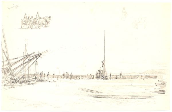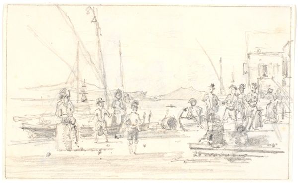 Curator: Oh, there’s a certain kind of wistful energy humming off this piece. Like catching a dream just as it slips away. Editor: Exactly. What we're seeing is Martinus Rørbye’s 1847 pencil drawing on paper, titled “Fishermen at Skagen Unloading a Boat with Peat.” A scene of everyday life rendered with such fleeting delicacy. Curator: "Fleeting delicacy," I like that. It does feel like a memory half-recalled. So many little vignettes scattered across the page. Did Rørbye intend this as a finished work or more of a preparatory study? Editor: Probably a bit of both, actually. Rørbye had a real eye for capturing a place and a moment. Skagen, as a fishing village, was bustling but remote, almost an island community in its way. Note how the figures carrying what seems to be peat create a visual rhythm across the plane, almost hieroglyphic in repetition. Curator: Yes! The recurring shape of the woven baskets mirrors the boat itself and perhaps even the small dune visible along the upper register. And each figure is so distinctly rendered, even within the spare style of a drawing. Like a private language for each one. The Romantic yearning to preserve vanishing ways of life feels really tangible here. Editor: Precisely. Peat, an ancient fuel source. Fishermen, clinging to traditional trades. It evokes a sense of the past pressing urgently into the present. The very act of drawing-- capturing the fleeting light and forms of the scene with pencil and paper—becomes a preservation. I notice a figure wading neck deep just off shore -- this posture of immersion gives an impression of vulnerability -- they brave the tides to earn a daily wage. Curator: It’s also rather poignant seeing all the notes jotted across the drawing. Those spontaneous observations, almost whispers between the artist and the scene, make me feel that it has never truly stopped living and changing in Rørbye's eyes. Editor: I agree, there is such immediacy in its creation. More than merely a record of work in this windswept town, this drawing feels like a tribute to the enduring human spirit facing nature’s harshness, or just an homage to that strange sensation we can get just by watching figures walking in the distance. Curator: Maybe both! Editor: Beautifully put. Thank you.